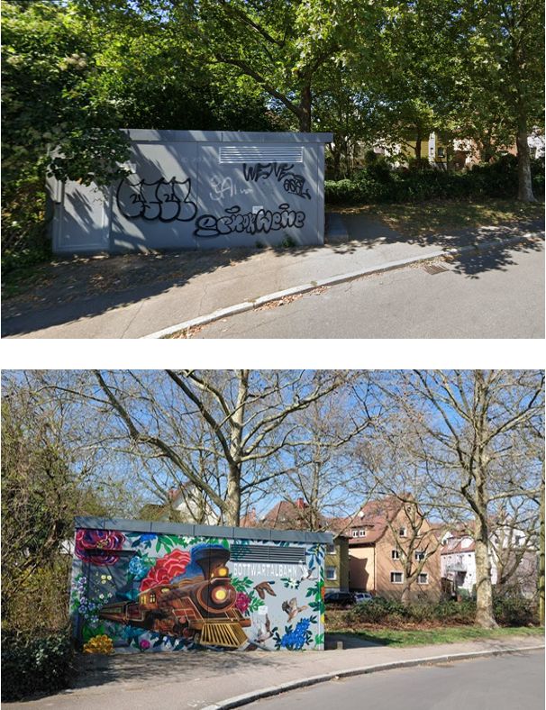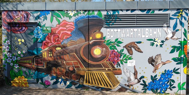 Die Trafostation an der Eythstraße wurde optisch aufgewertet mit einer künstlerischen Darstellung der ehemaligen Bottwartalbahn, im Volksmund auch „Entenmörder“ genannt. Danke für den Schnappschuss an unser Vereinsmitglied Raimund Köhler!
