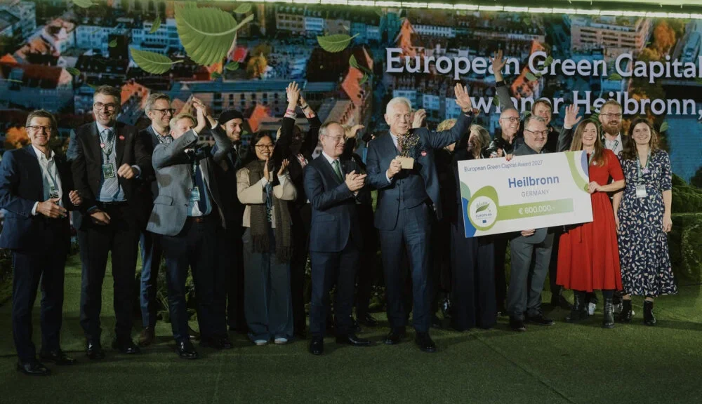 Siegerfoto Team Heilbronn bei der Verleihung des European Green Capital Awards 2027 (J. Boysen / J. Hufnagel)