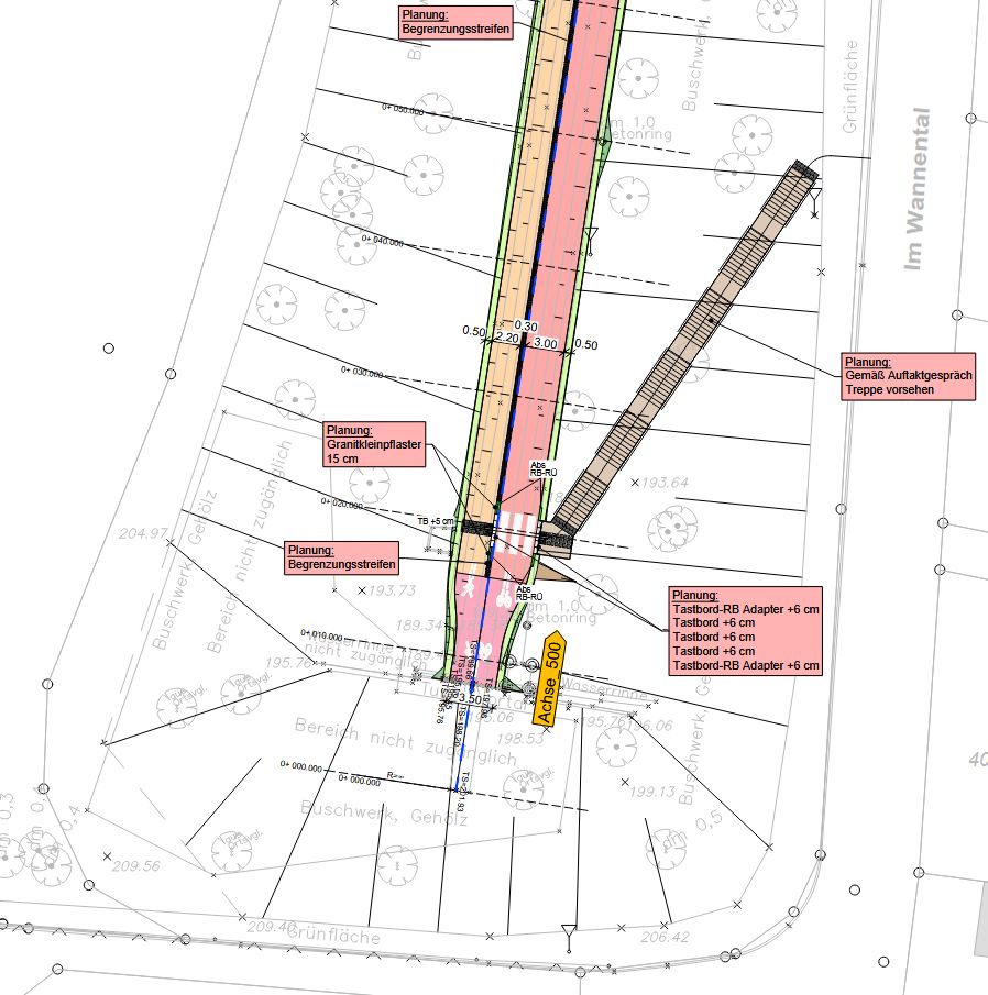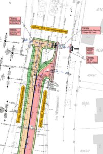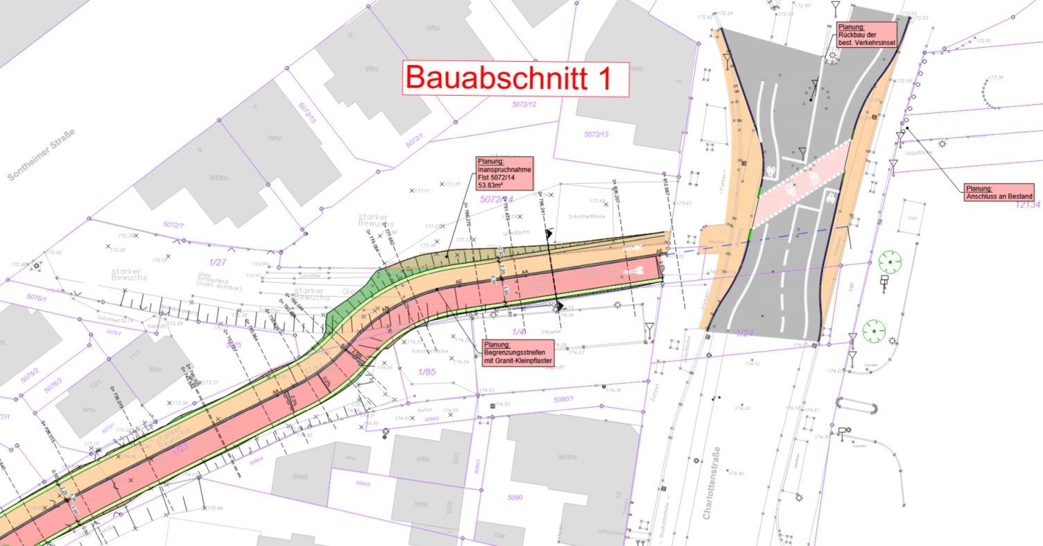 Ob der Weg auf den letzten Metern bis zur Charlottenstraße am bestehenden Parkplatz vorbei geführt werden kann (vgl. Planausschnitt), ist derzeit noch in Klärung.