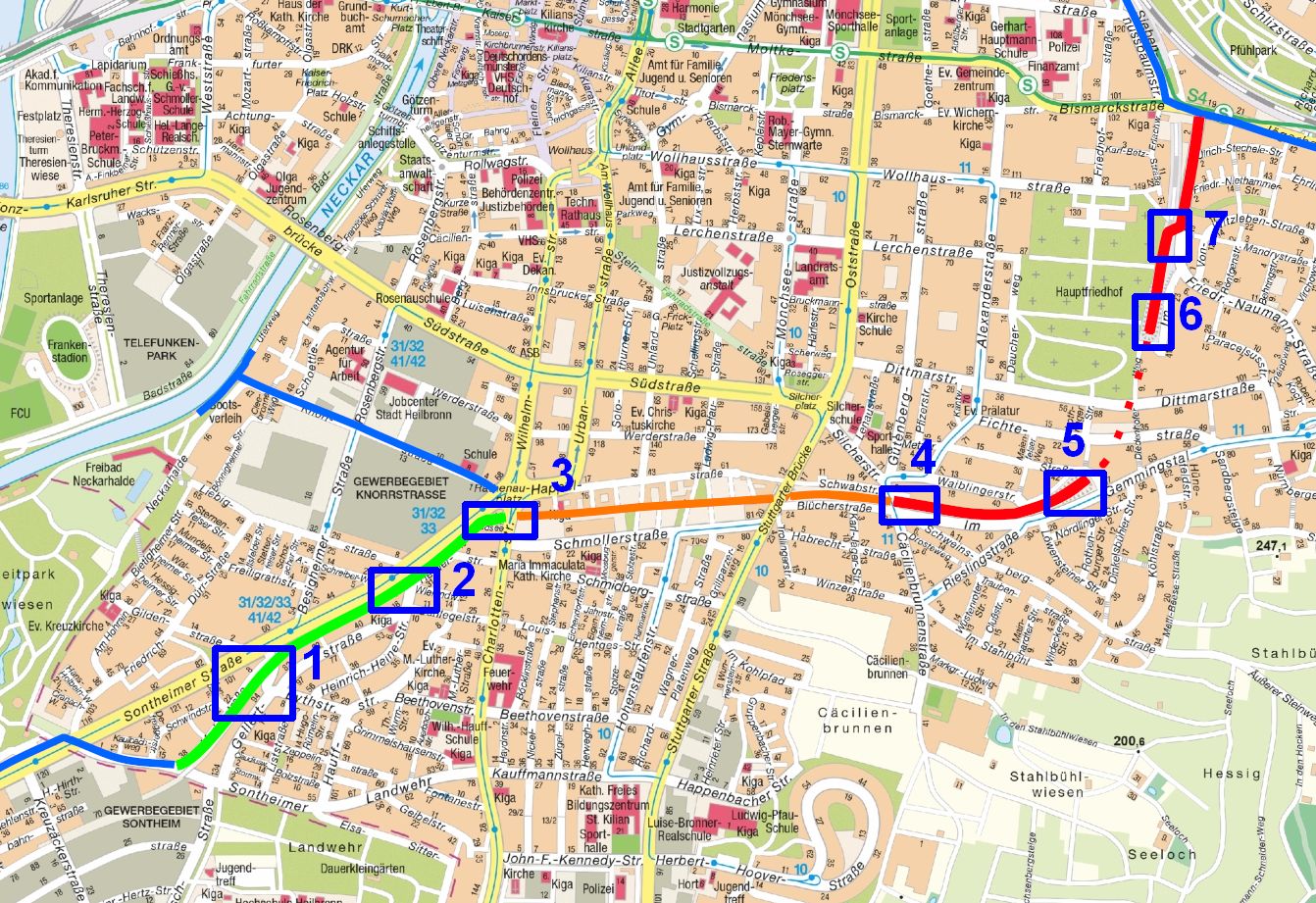 Die Fuß- und Radwegverbindung verläuft entlang der ehemaligen Bottwarbahntrasse. Der Planungsraum beginnt im Süden an der Sontheimer Landwehr. Dort sind sowohl Brücke als auch Bahndamm vorhanden. Der Abbruch beider Elemente ist mit enormen Kosten verbunden. Zudem zeichnet sich der Abschnitt durch einen hochwertigen Bewuchs mit Büschen und Bäumen aus, den es zu erhalten gilt. Daher werden die Radfahrenden bis zur Schwindstraße auf der Fahrbahn der Merkurstraße geführt. Der Abschnitt wird zur Fahrradstraße umgewandelt.