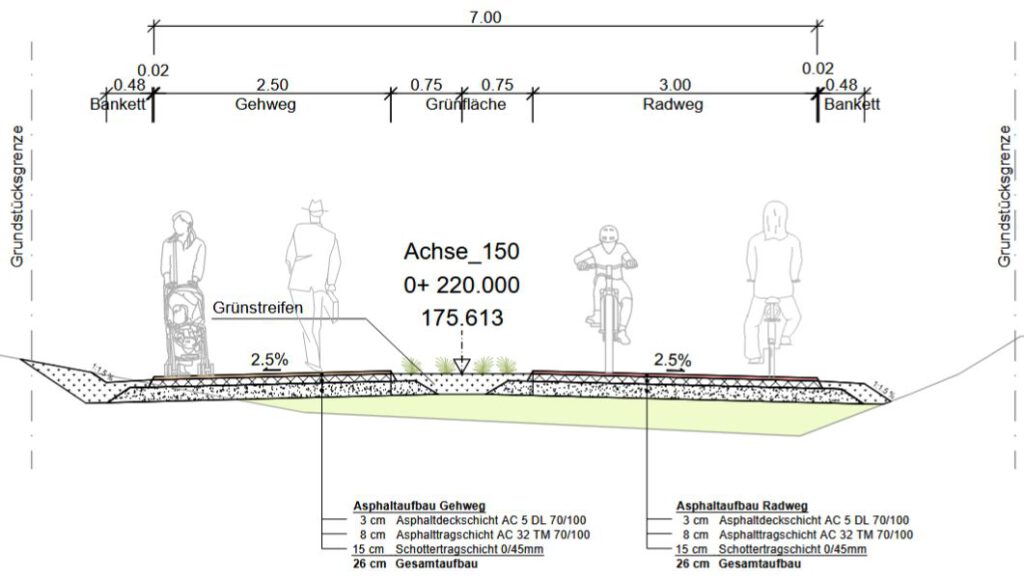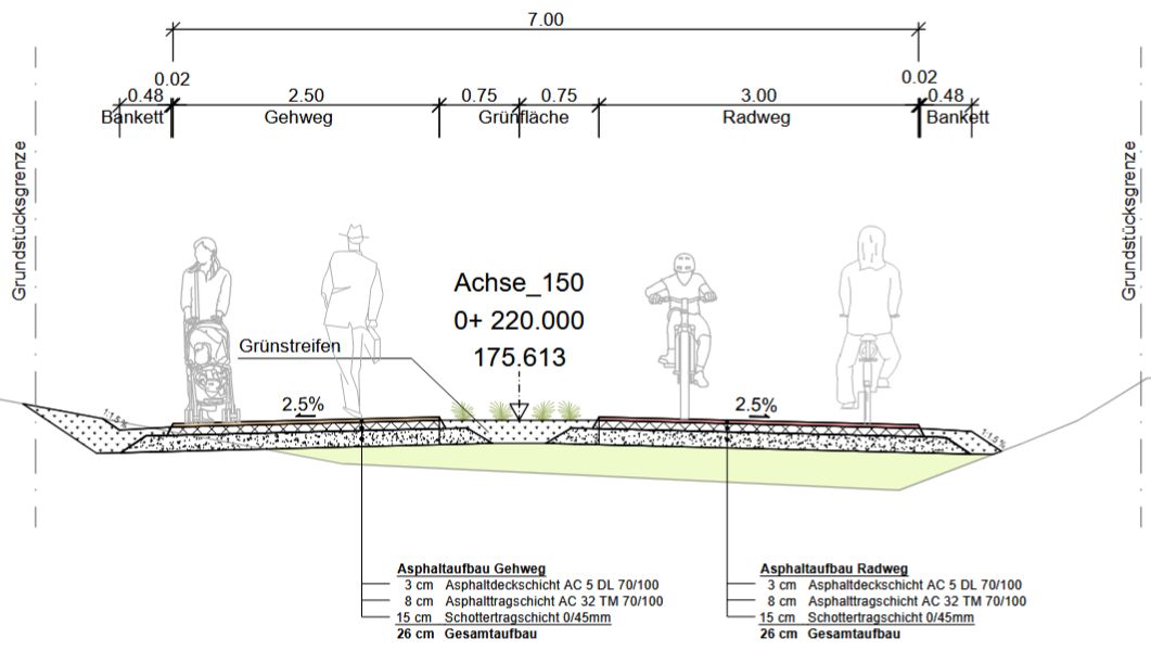Regelquerschnitt: Gehweg 2,50m, Radweg 3,00m, Grüntrennfläche 1,50m; der Regelquerschnitt kann nicht auf der gesamten Strecke umgesetzt werden